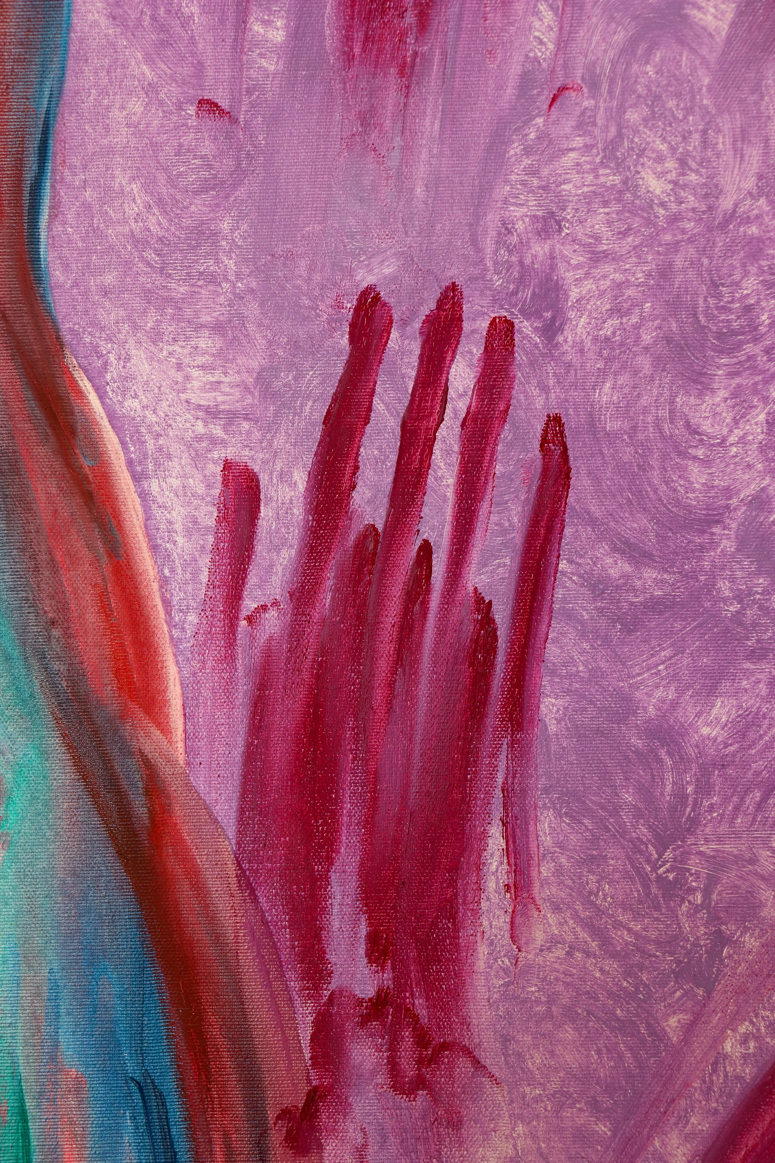 Set against a lilac background—an airy representation of femininity—the painting juxtaposes softness with struggle. Hands emerge from the canvas, carrying a triple meaning: society’s relentless attempt to mold women, the oppressive grasp of men, and the bloody, resilient fight of strong women reclaiming their voice and space in the world.